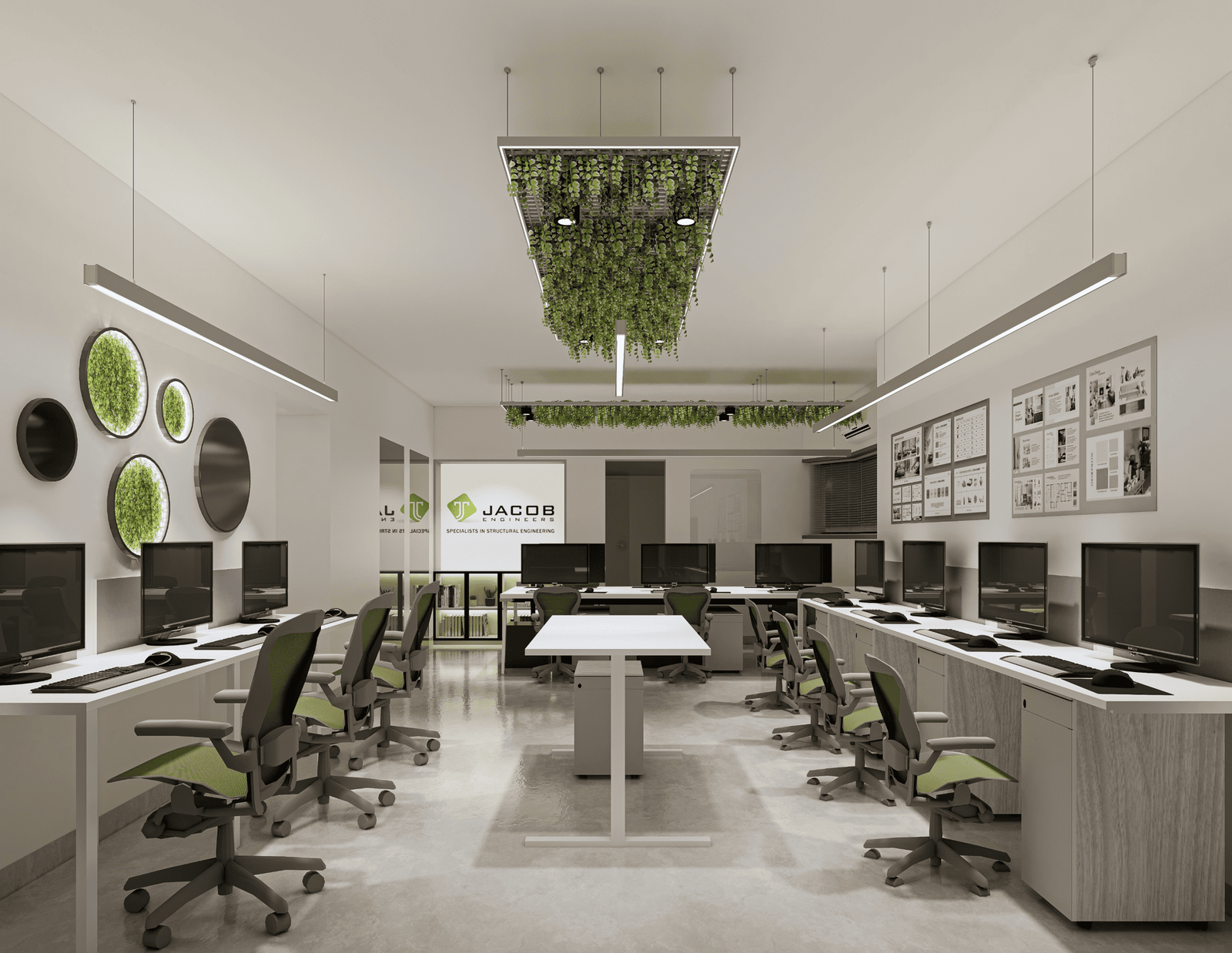 The Jacob Engineers Office Workspace is designed as a clean, efficient, and collaborative environment that reflects precision and technical expertise. The design focuses on creating an open-plan layout that encourages teamwork while maintaining individual work efficiency.