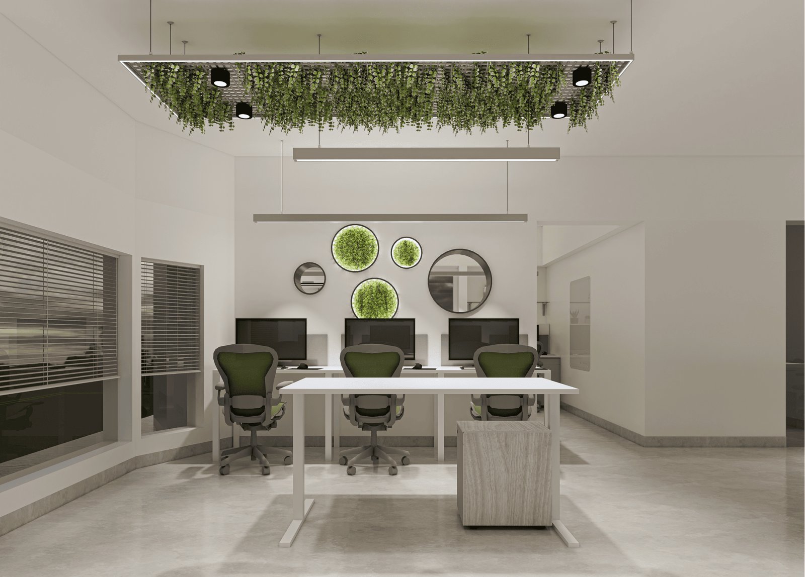A neutral palette of whites and soft greys establishes a calm professional atmosphere, complemented by green ergonomic seating that adds vibrancy and aligns with the biophilic theme. Suspended ceiling grids with cascading greenery introduce natural elements into the workspace, enhancing visual comfort and employee well-being.