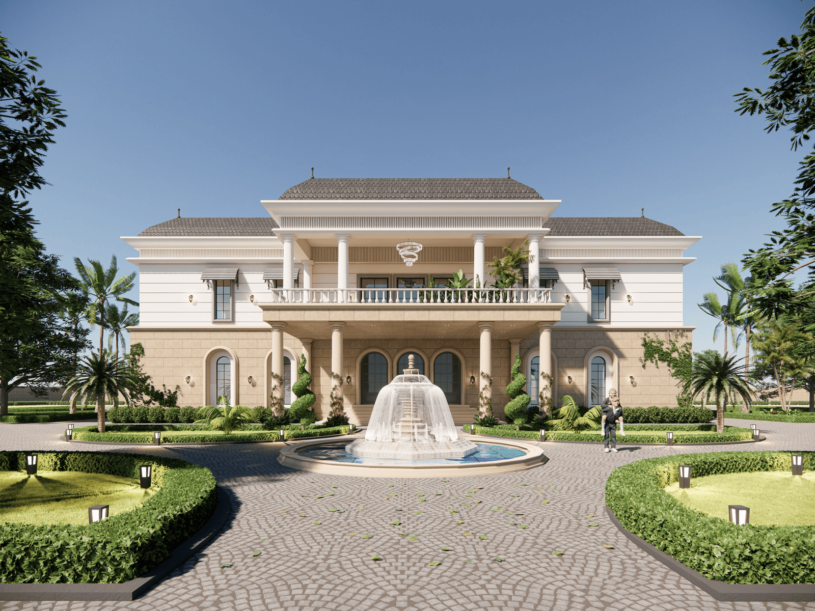 The exterior landscape is equally expressive, with a central fountain court, manicured lawns, and symmetrical pathways reinforcing the architectural language. Large balconies and arched windows ensure openness while maintaining the estate’s regal presence.