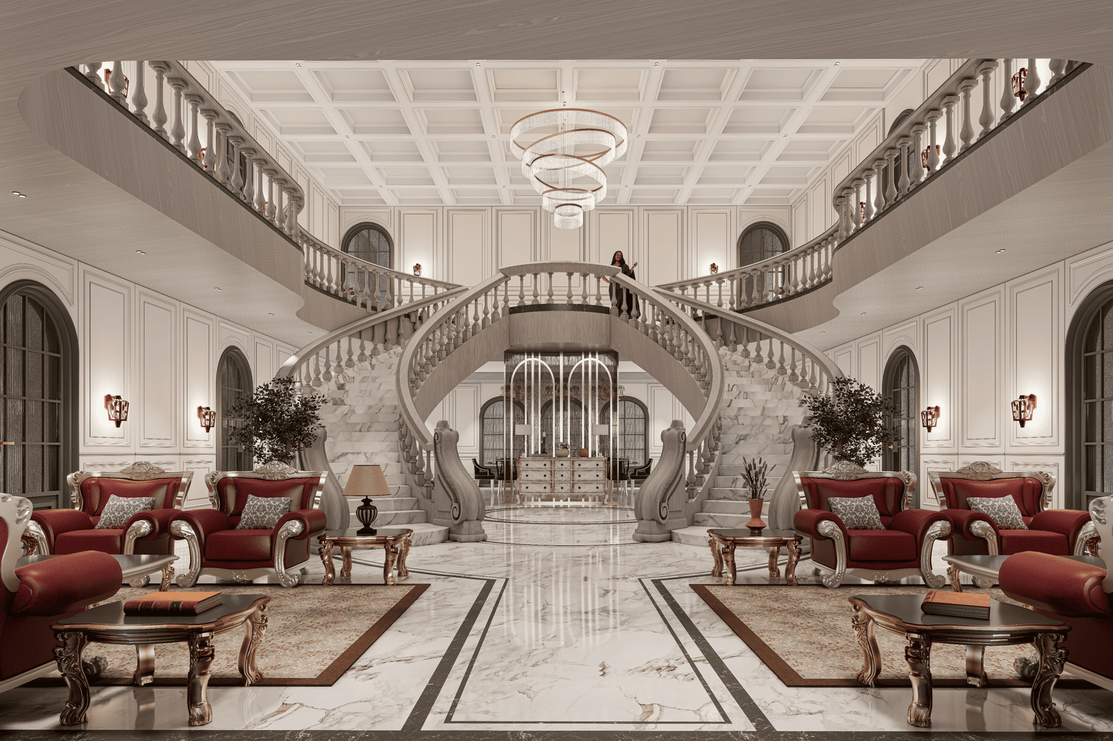 The double-height entrance lobby welcomes visitors with a majestic curved staircase, coffered ceilings, and a statement chandelier that becomes the visual centerpiece of the space. Rich marble flooring, ornate moldings, and handcrafted furniture elements enhance the sense of luxury and refinement.