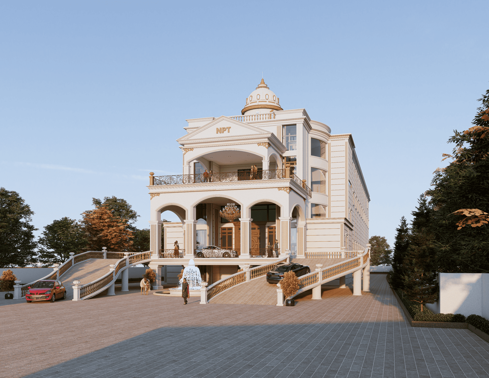 NPT Farm House is designed as a grand classical residence that embodies elegance, symmetry, and timeless architectural character. Inspired by neoclassical design principles, the structure features tall columns, arched openings, detailed cornices, and a balanced façade composition.