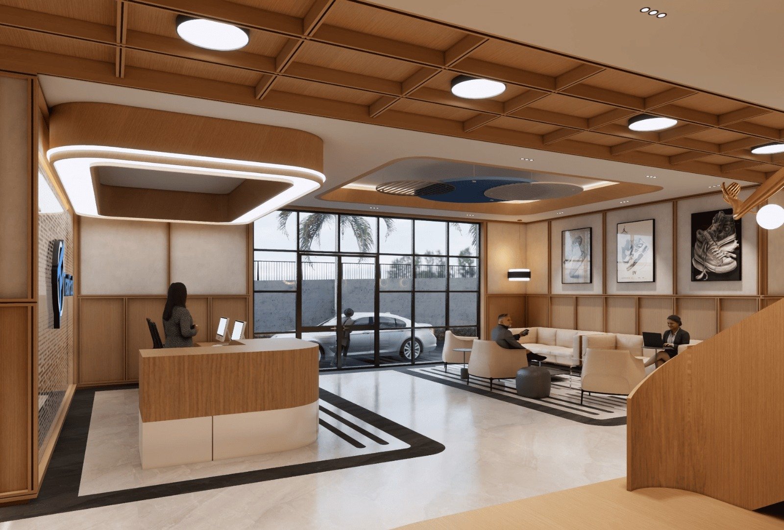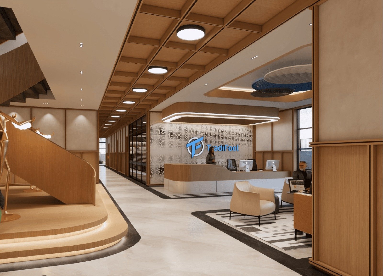 The TradiFoot Corporate Office is designed as a modern workplace that blends functionality, comfort, and strong brand identity. The interior design focuses on creating a professional environment where employees can work efficiently while clients and visitors experience a welcoming and refined space.