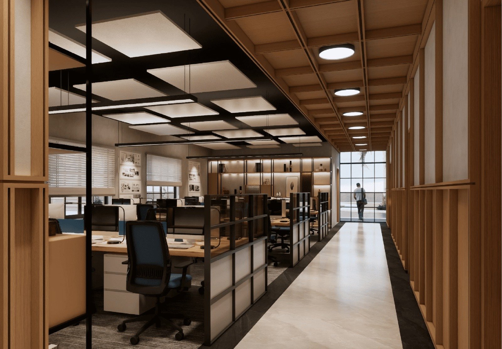 The project emphasizes clean architectural lines, warm wooden textures, and modern lighting elements that create a sophisticated and contemporary corporate atmosphere.
